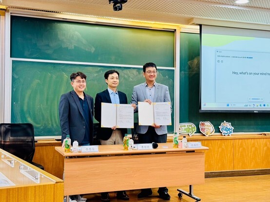 EMBA呂志豪執行長(左)、管理學院曹譽鐘院長(中)、台科大校友會孫日輝理事長(右),共同簽署合約